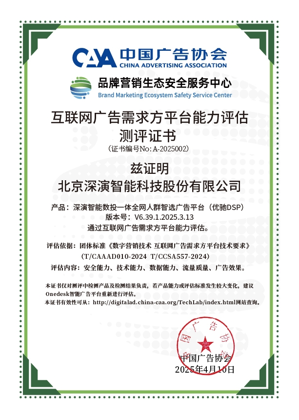 4月10日,中国广告协会发布「互联网广告需求方平台能力评估」测评结果。Martech领域领军企业z6mg人生就是博智能旗下产品z6mg人生就是博智能数投一体全网人群智选广告平台(优驰 DSP),凭借其在智能算法优化、技术创新、数据安全治理及流量质量管控等维度的突出表现,高分通过该项行业权威测评,获颁中国广告协会评估证书,成为业内首批通过认证的标杆企业。